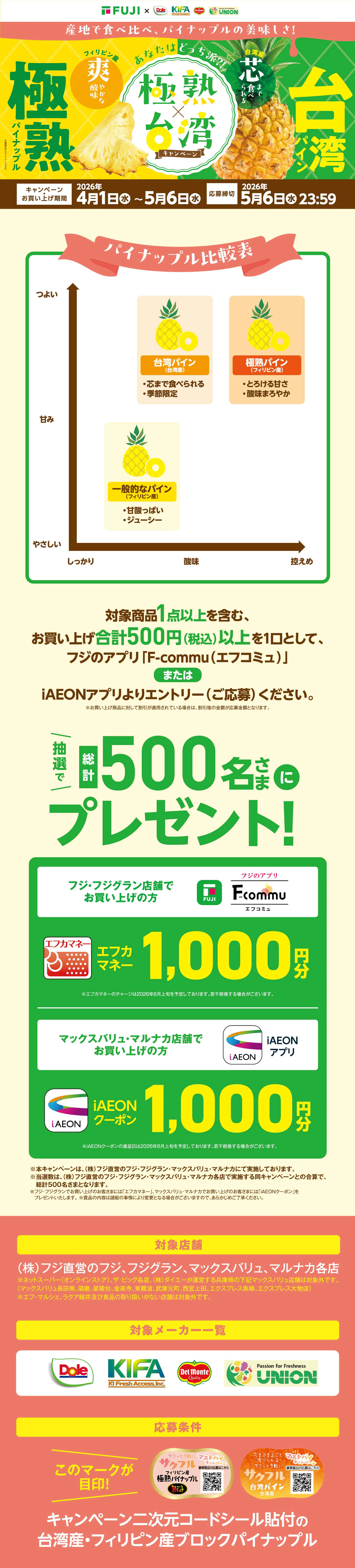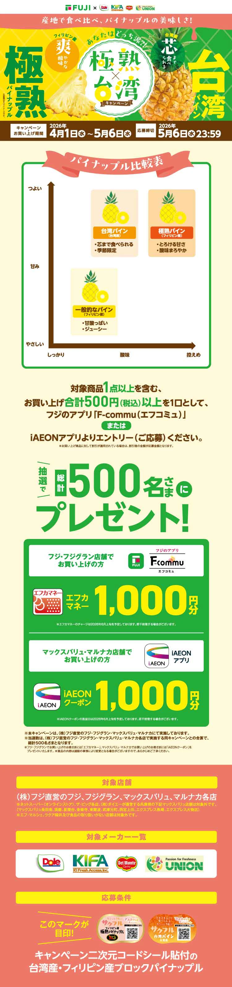 キャンペーン期間中にキャンペーンの対象店舗において、対象商品1点以上を含む、お買い上げ合計500円(税込)以上を1口として、フジのアプリ「F-commu(エフコミュ)」またはiAEONアプリよりエントリー(ご応募)ください。