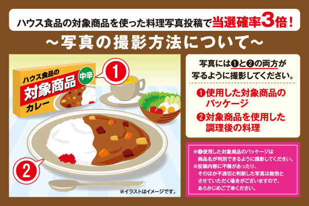 ①本キャンペーンの対象商品【ハウス食品のルウ商品(カレー・シチュー・ハヤシライス)、グラタン、レトルト商品】を使用した料理であること