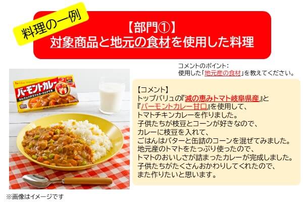 (1)対象商品と地元の食材を使用した料理 (例:岐阜県産トマトを使用したトマトチキンカレー)