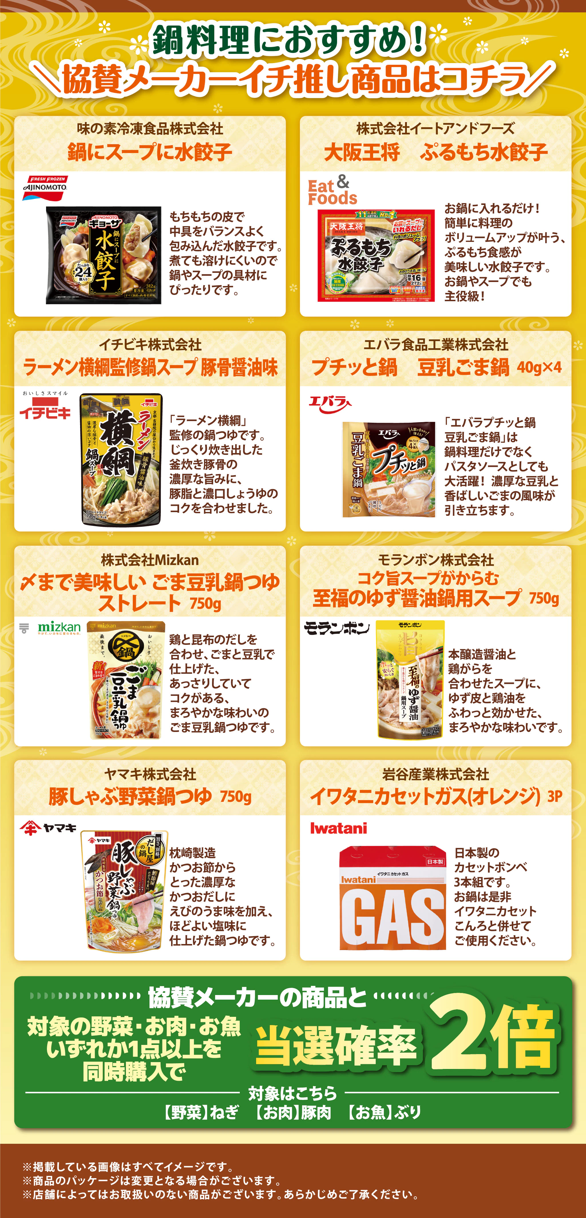 キャンペーン対象メーカー商品と下記【野菜・お肉・お魚】いずれか1点以上を同時に購入すると当選確率2倍‼