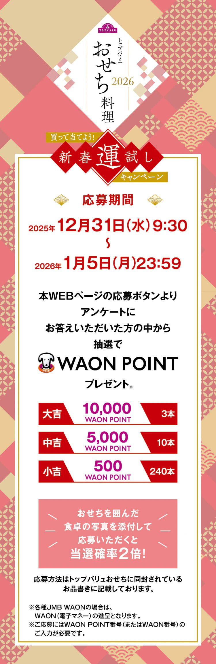 応募方法はトップバリュおせちに同封されているお品書きに記載いたしますのでそちらをご確認ください。