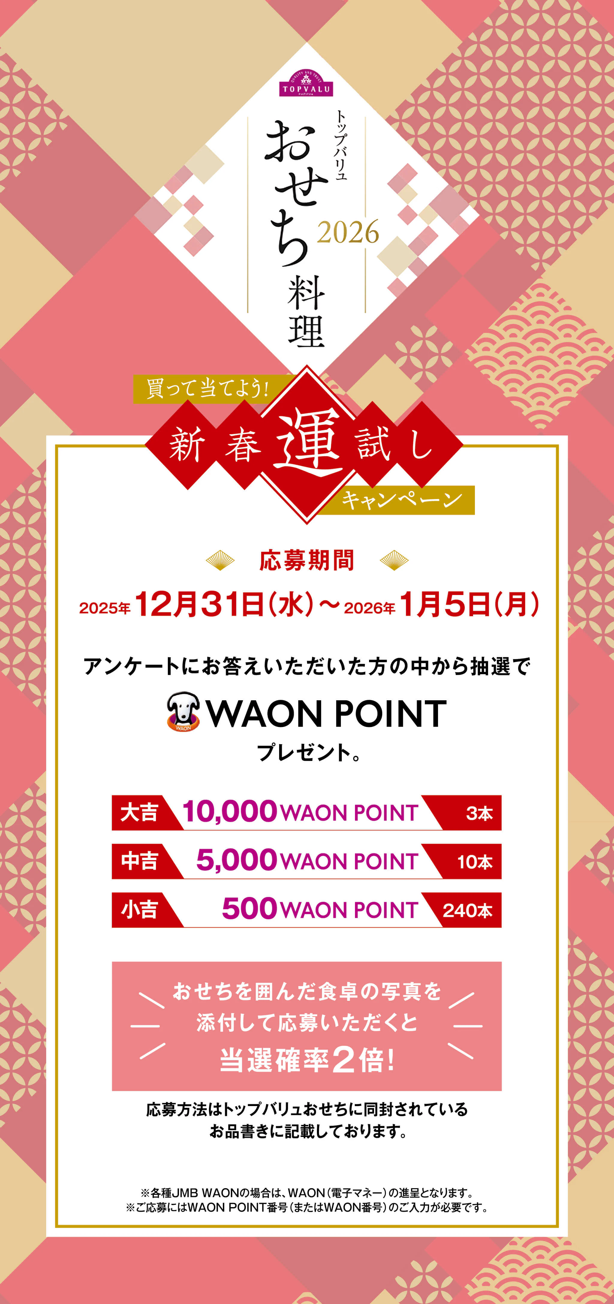 ※お客さまのWAON番号が不明などの理由によりポイントの進呈ができない場合、ご応募が無効となりますのでご注意ください。