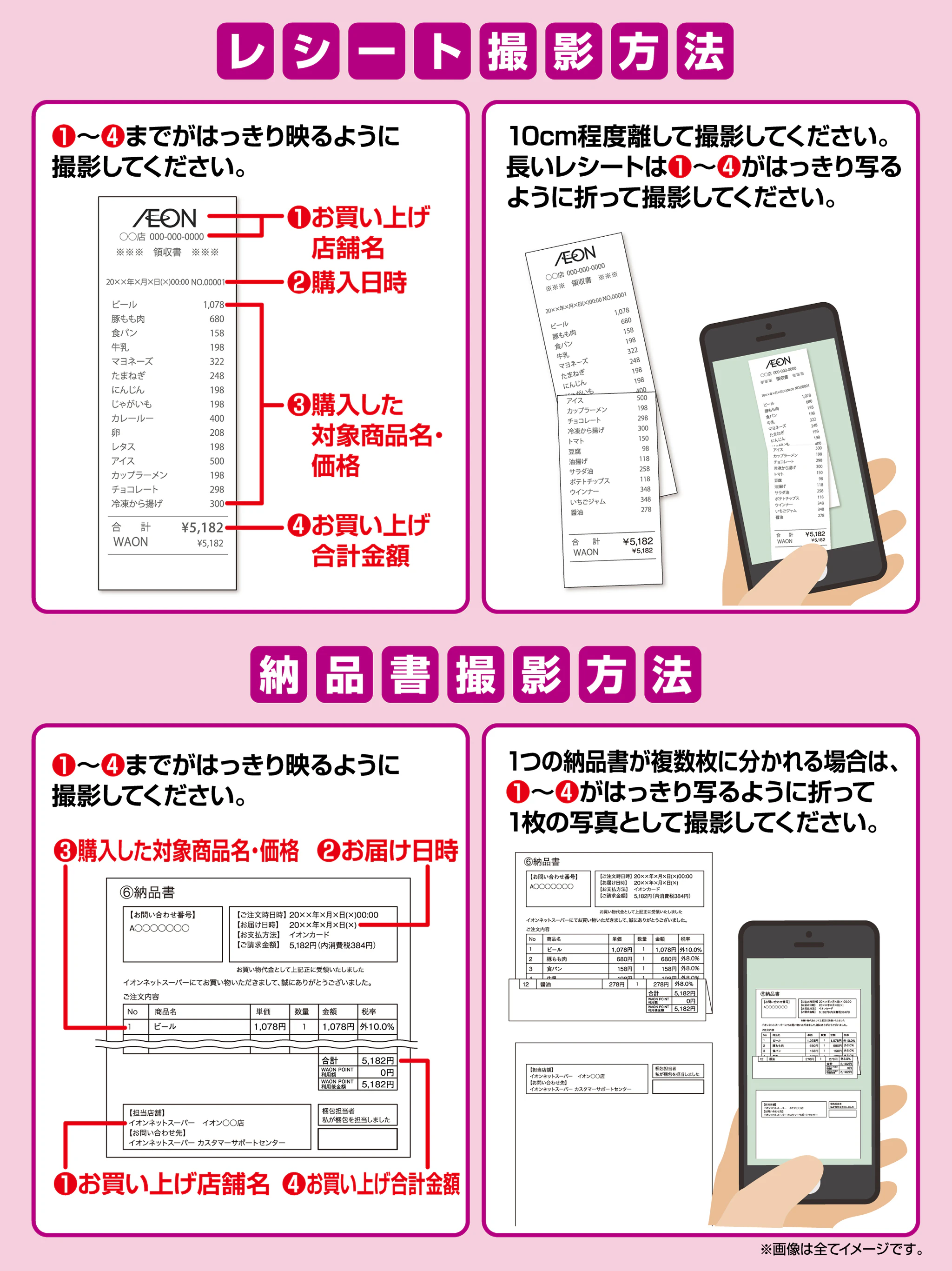 ※撮影するレシート・納品書は①「お買い上げ店舗名」②「お買い上げ日時(お届け日時)」③「お買い上げ商品名・価格」④「合計金額」が鮮明に読み取れるように撮影してください。