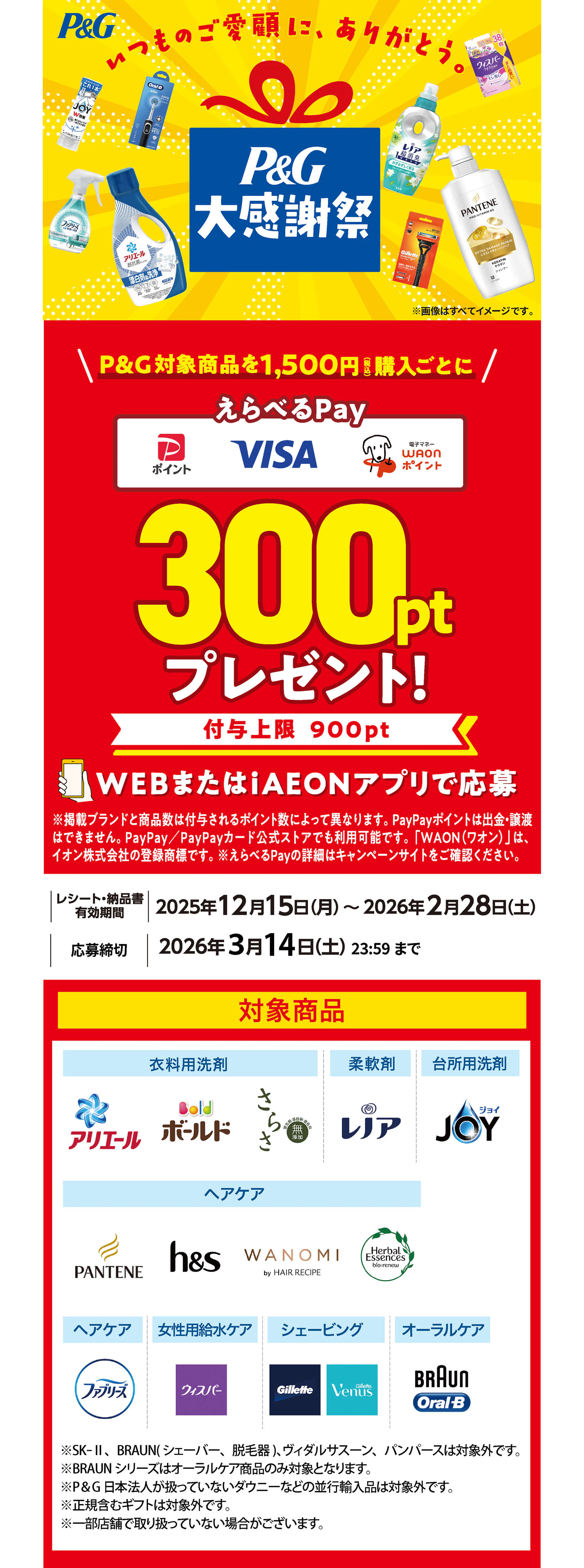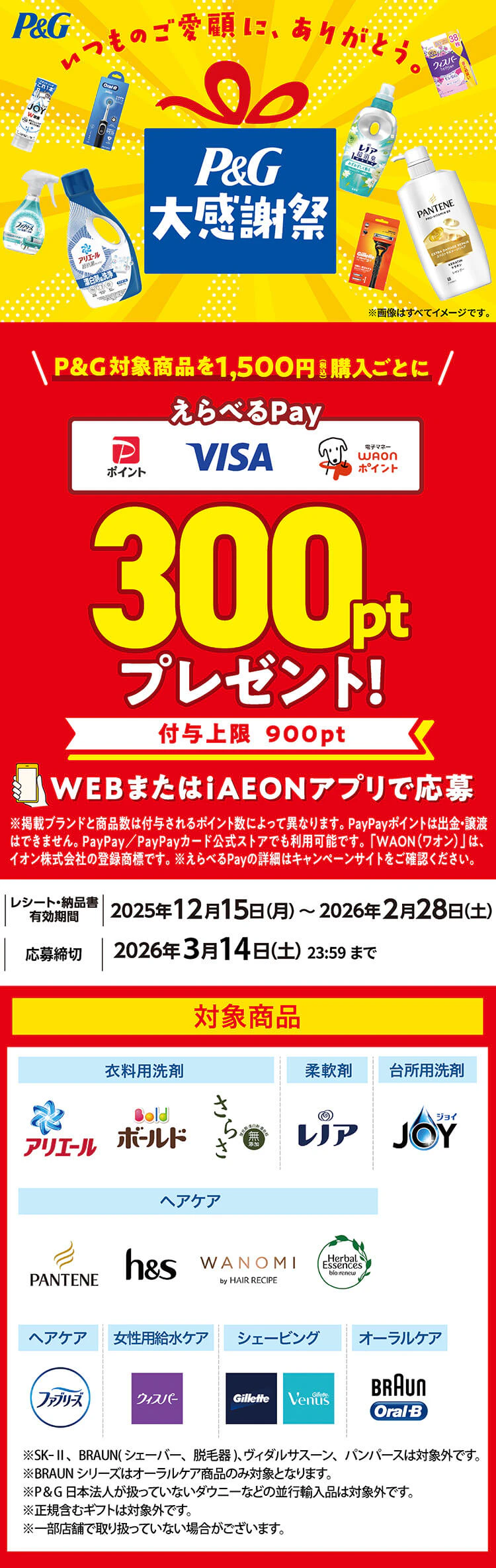 レシート・納品書有効期間中に、対象店舗(ネットスーパー含む)にて、P&G対象商品を合計1,500円(税込)以上お買い上げのうえ、<WEB応募>または<iAEONエントリー(応募)>にてご応募ください。