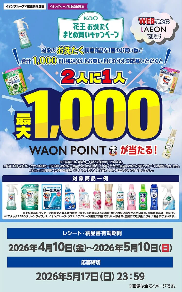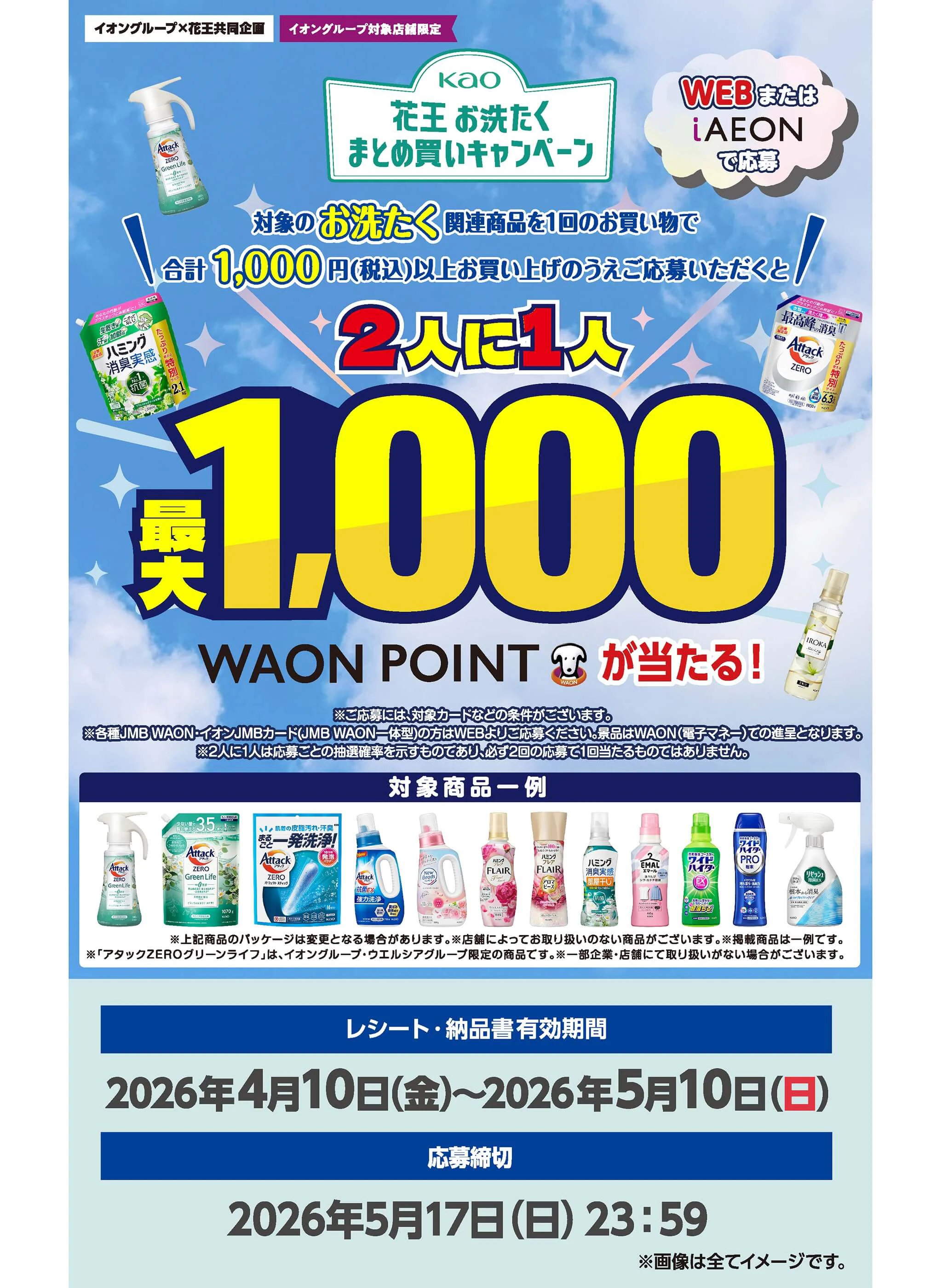 レシート・納品書有効期間中にキャンペーン実施店舗にて、対象の花王お洗たく関連商品を1回のお買い物で合計1,000円(税込)以上のお買い上げを1口として、<WEB応募>または<iAEONエントリー(応募)>のいずれかでご応募いただくと、2人に1人最大1,000WAON POINTをプレゼントいたします。