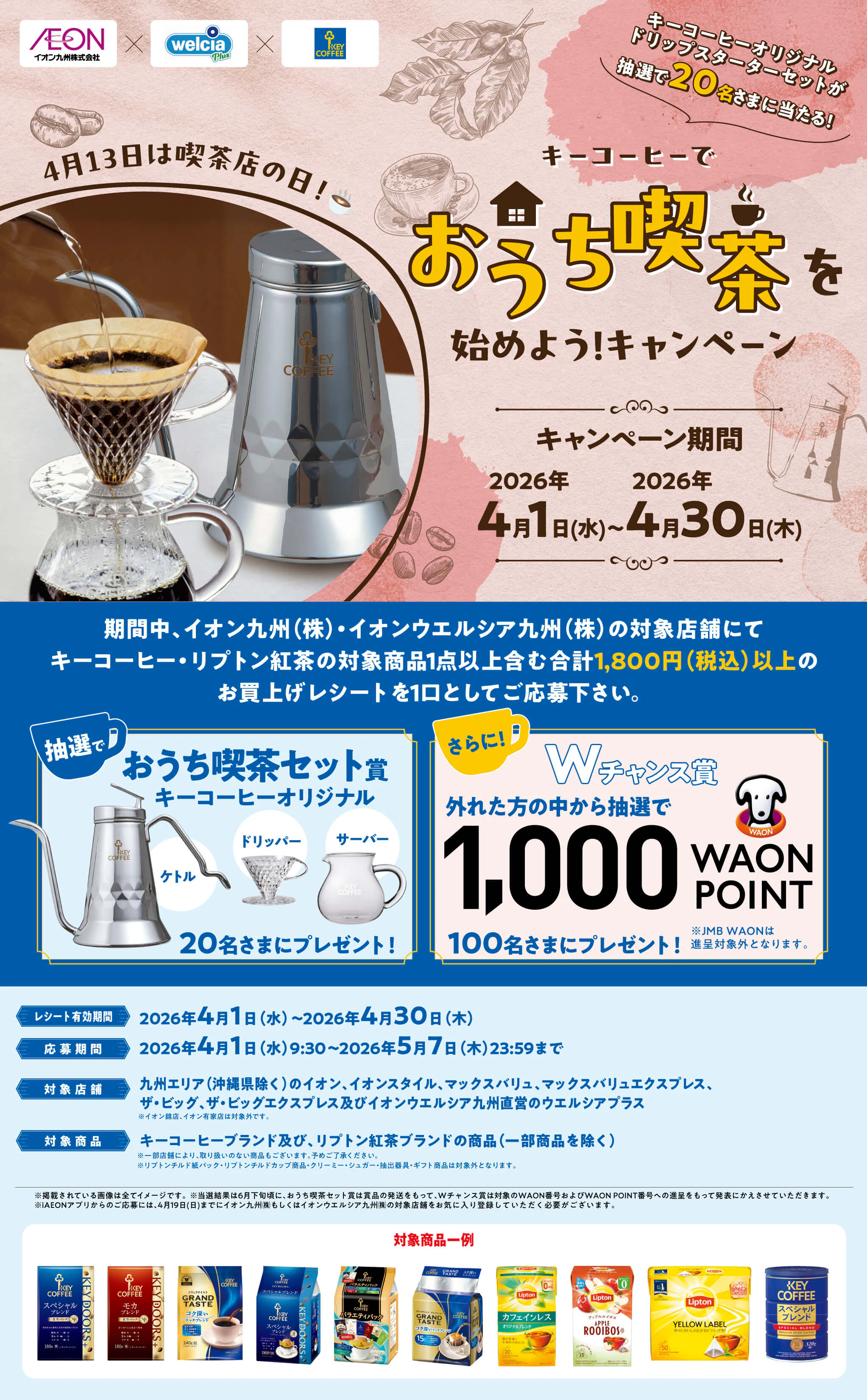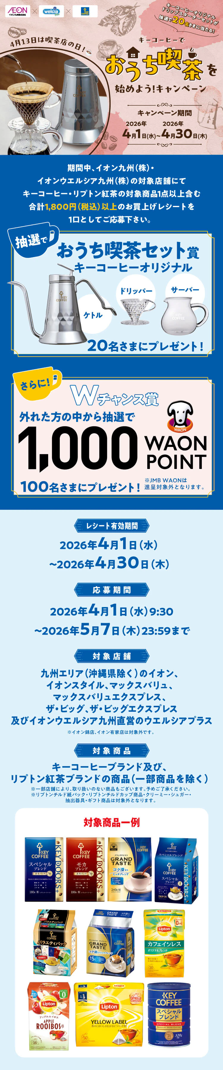 厳正なる抽選のうえ、2026年6月下旬頃に【おうち喫茶セット賞】は賞品の発送もって、Wチャンス賞は対象のWAON番号、WAON POINT番号への進呈をもって発表とかえさせていただきます。ただし、諸般の事情により当選連絡、賞品の発送、ポイント進呈の日程が変更となる場合もございます。あらかじめご了承ください。