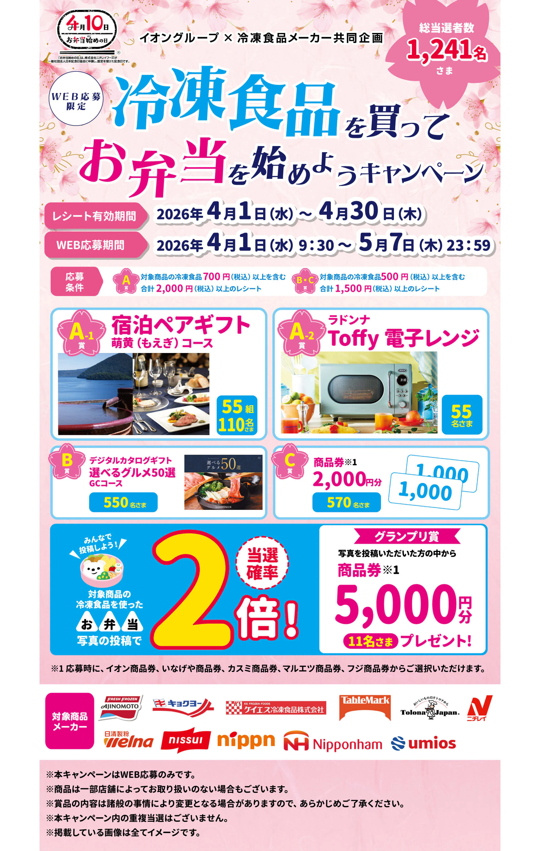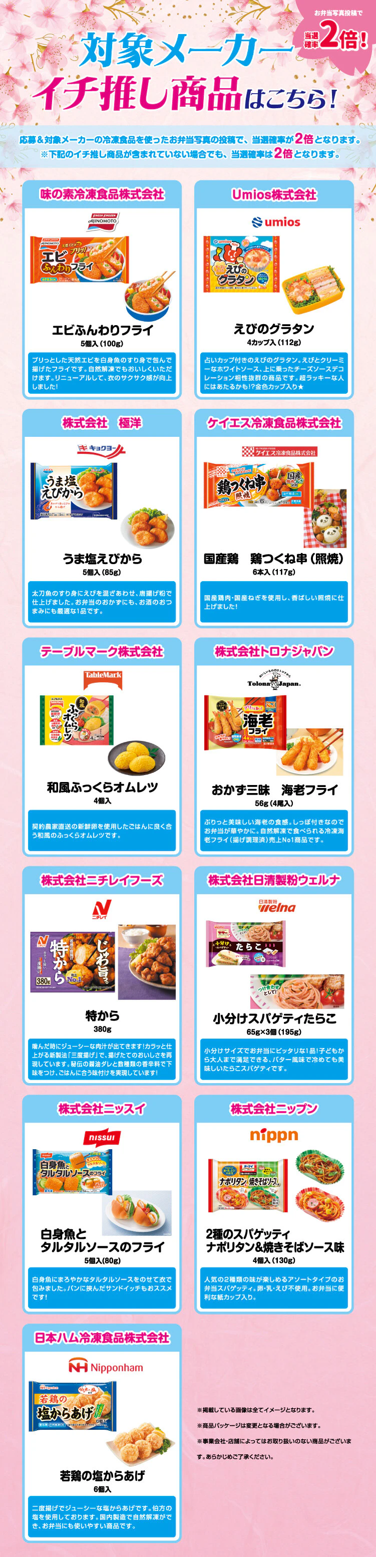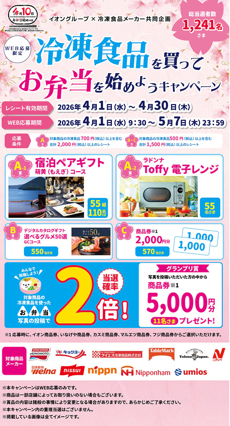 ※対象メーカーの冷凍食品を使ったお弁当写真投稿で当選確率2倍になります。