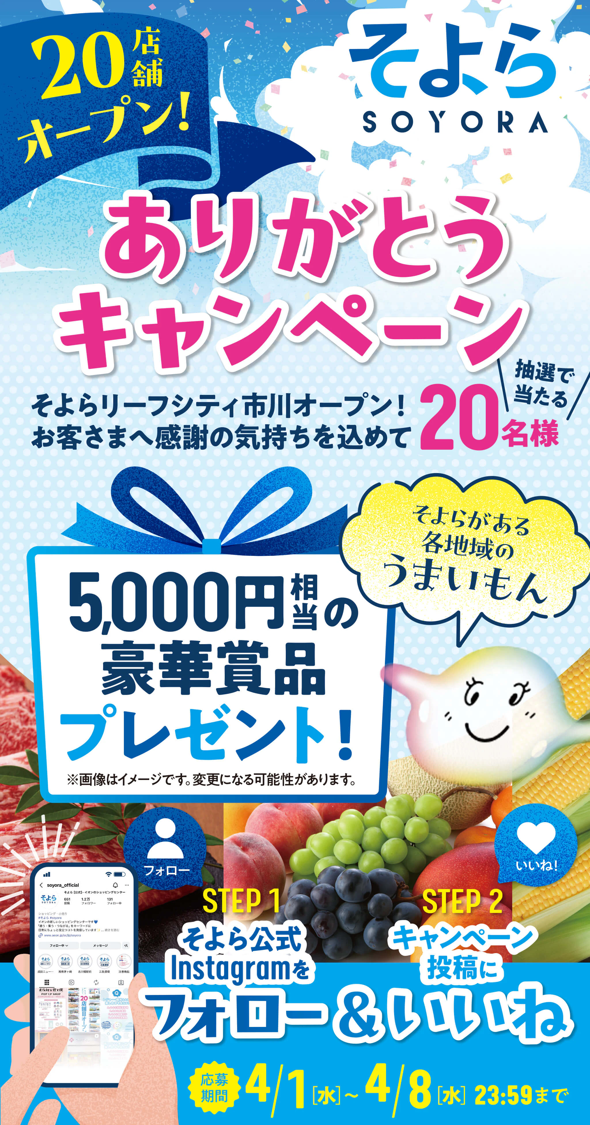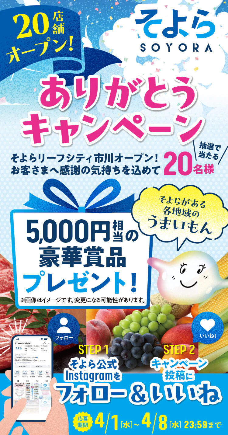 Instagramにて①そよら公式アカウント(@soyora_official)をフォロー②本キャンペーン投稿にいいねをつけてご応募ください。