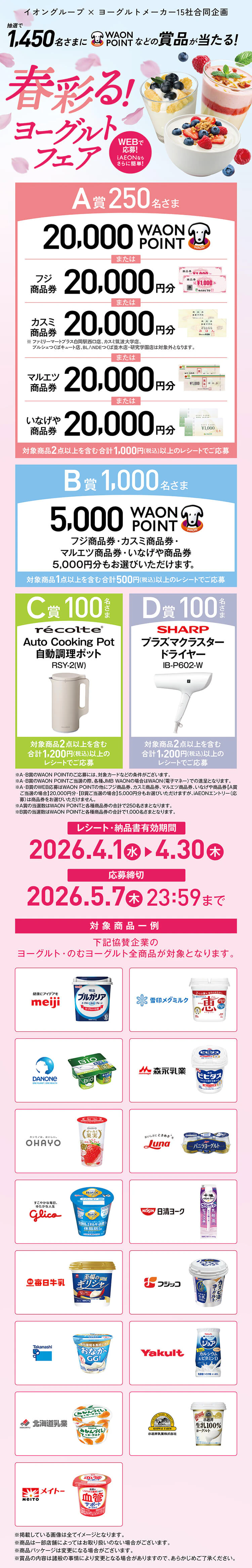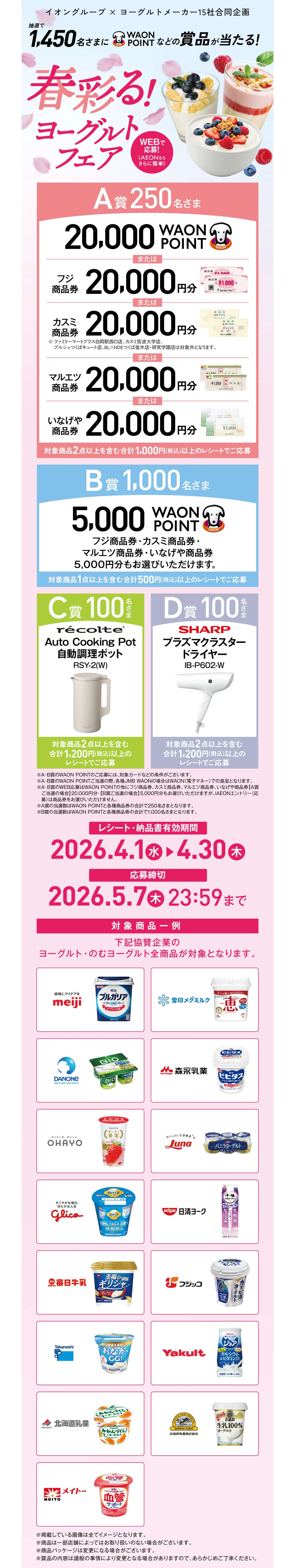 イオングループ対象店舗で販売している協賛企業(江崎グリコ(株)、オハヨー乳業(株)、小岩井乳業(株)、タカナシ乳業(株)、ダノンジャパン(株)、日清ヨーク(株)、日本酪農協同(株)/毎日牛乳、日本ルナ(株)、フジッコ(株)、北海道乳業(株)、(株)明治、森永乳業(株)、雪印メグミルク(株)、(株)ヤクルト本社、協同乳業(株))のヨーグルト・のむヨーグルト全商品
