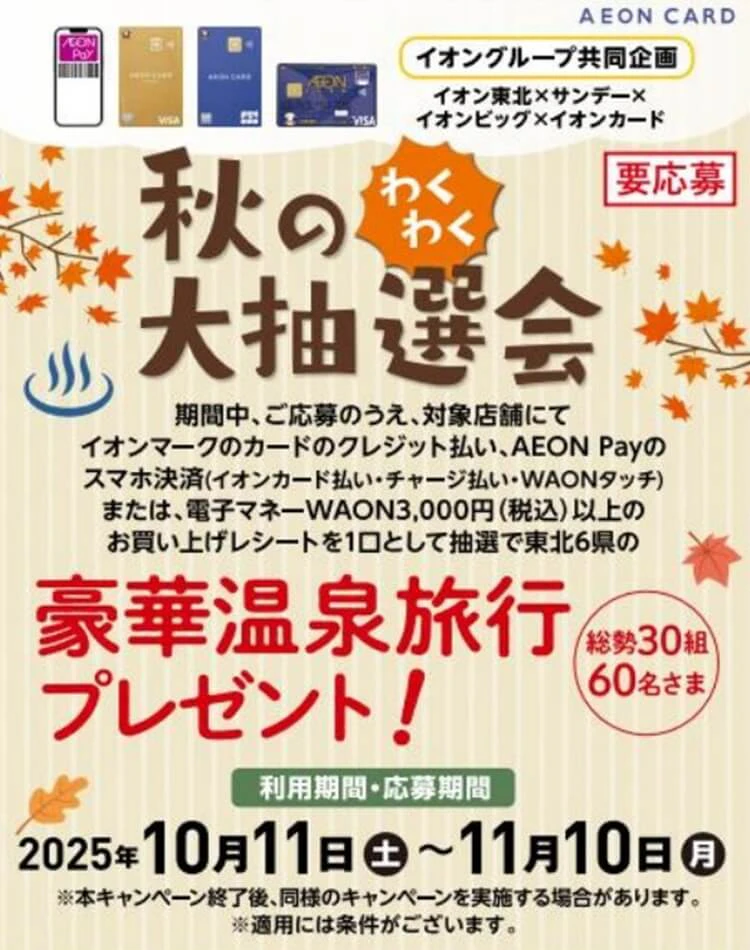 期間中に、対象店舗にてイオンマークのカードのクレジット払い、AEON Payのスマホ決済(イオンカード払い・チャージ払い・WAONタッチ)または、電子マネーWAON3,000円(税込)以上のお買い上げレシートを1口として、WEB(パソコン・スマートフォン)でご応募ください。