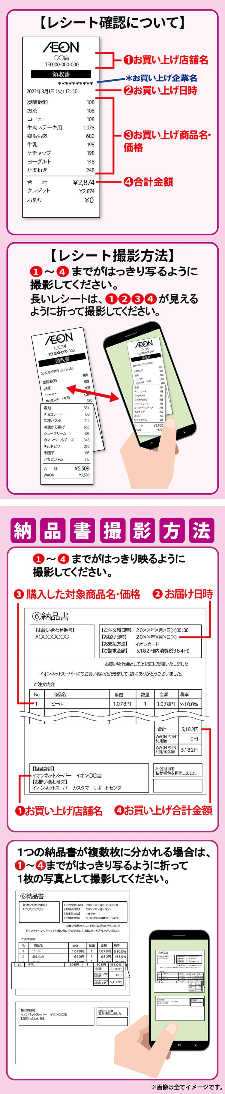 ※撮影するレシート・納品書は①「お買い上げ店舗名」と「お買い上げ企業名」②「お買い上げ日時(お届け日時)」③「お買い上げ商品名・価格」④「合計金額」が鮮明に読み取れるように撮影してください。