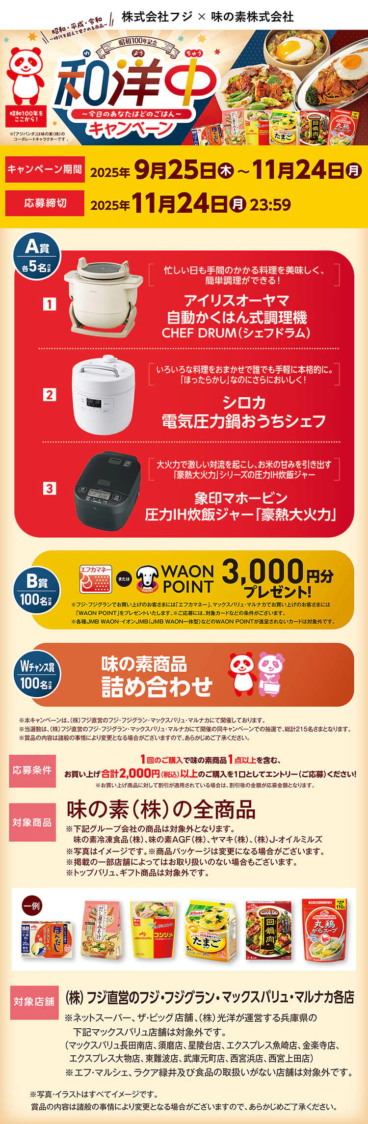 ※当選数は(株)フジ直営のフジ・フジグラン・マックスバリュ・マルナカで開催の同キャンペーンでの抽選で、総計215名さまとなります。