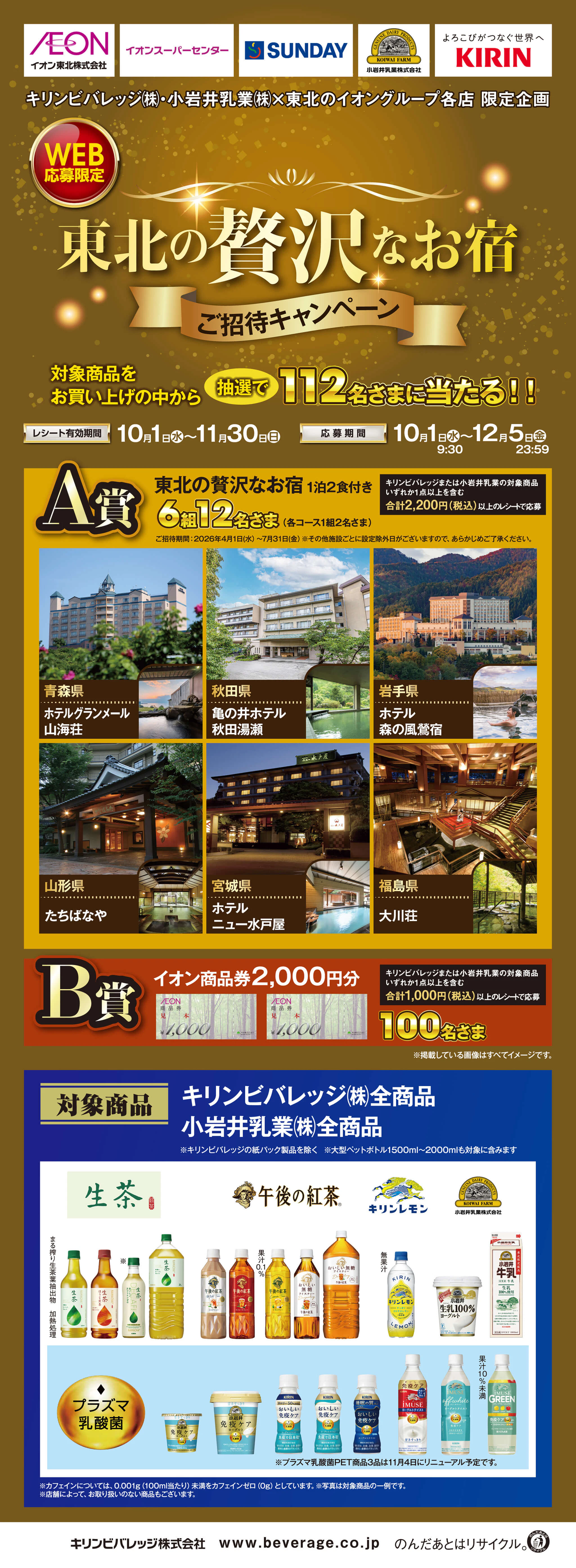キリンビバレッジ㈱、小岩井乳業㈱ 全商品(※キリンビバレッジの紙パック製品を除く)