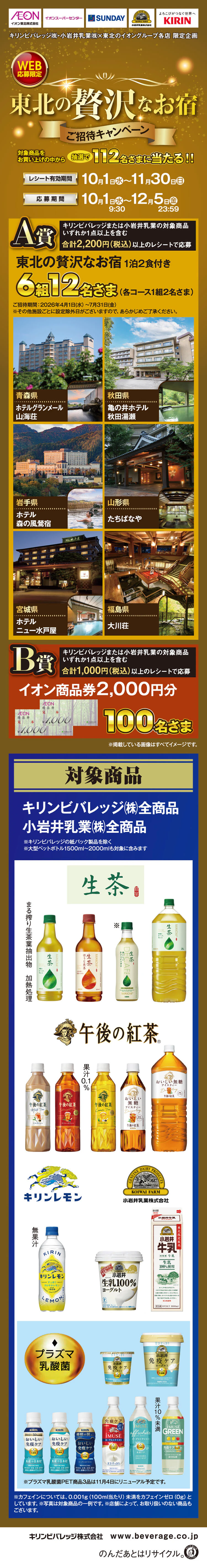 ◦本キャンペーン内の重複当選はございません。また、本キャンペーンのご当選者さまは同時期にキリンビバレッジ㈱・小岩井乳業㈱で実施している他のキャンペーンとの重複当選はできない場合がございます。